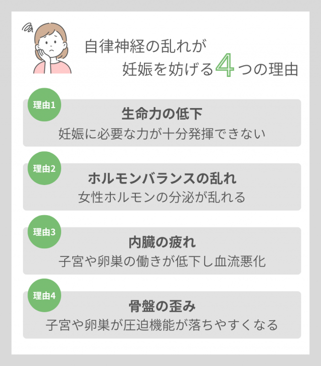 自律神経が乱れると、ホルモン分泌や血流、子宮・卵巣の働きにも影響が出て、妊娠に必要な体の機能がうまく働かなくなり、次のような不調が“妊娠の妨げ”になることがあります。