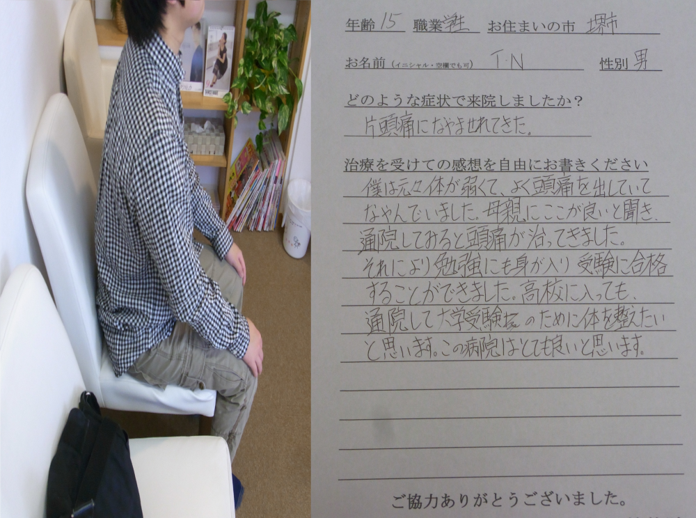 僕は元々体が弱く、良く頭痛が出て、悩んでいました。母親にここが良いと聞き通院してみると頭痛が治ってきました。それにより勉強にも身が入り高校受験に合格することが出来ました。高校に入っても通院して大学受験のために体を整えたいと思います。この治療院はとても良いと思います。