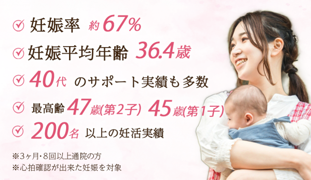 妊娠された方の平均年齢は36.4歳、最高齢は45歳(お一人目)・47歳(お二人目出産時)です。