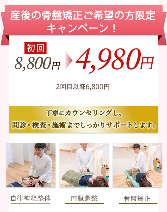 骨盤はもちろん、内臓や自律神経の働きも回復させることで、出産前の健康な状態へ導きます。